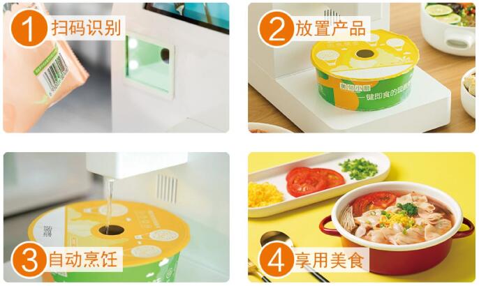 基于美鄰小廚自主研發的智能烹飪機,用戶只需取餐并掃碼,由烹飪機對餐飲產品進行識別,從云端下載相對應的加熱曲線與加工流程后,烹飪機便會自動自動烹飪,無明火、零排放,完美還原食材本味。經過智能烹飪機270度高溫自動烹飪,3-5分鐘高溫滅菌后出餐,保證食品衛生和安全。